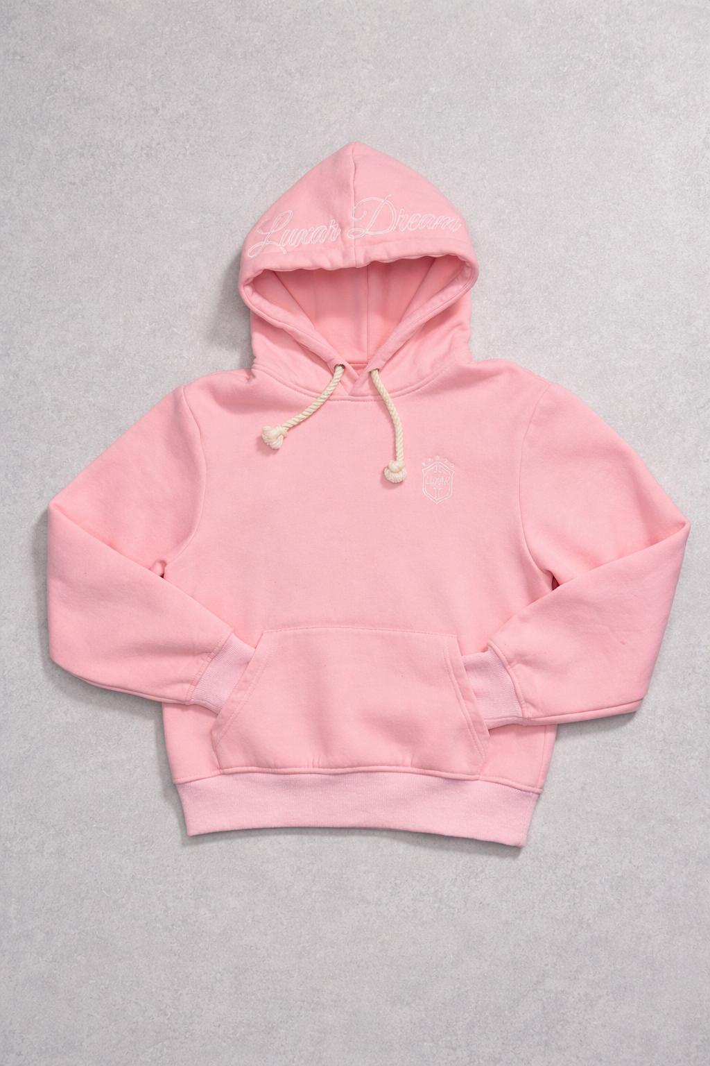 Hoodie de corte clásico con capucha ajustable mediante cordones trenzados en tono claro. Cuenta con bolsillo frontal tipo canguro y acabados acanalados en puños y bajo para un ajuste cómodo. En el pecho incorpora el emblema Luxar con bordado 3D, aportando relieve y carácter, mientras que en la capucha destaca el texto “Luxar Dream” con bordado normal, logrando un acabado limpio y elegante.